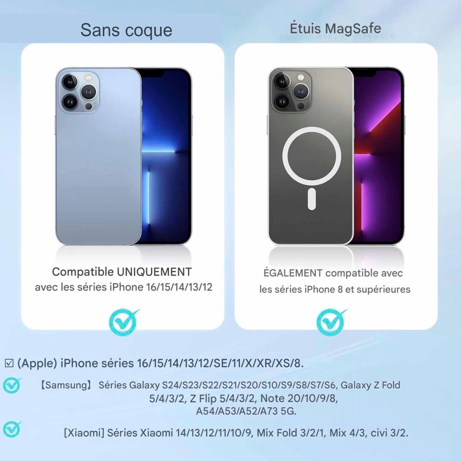 Grâce à son aimant puissant, ton téléphone se fixe parfaitement à la base pour une charge rapide et sans fil.